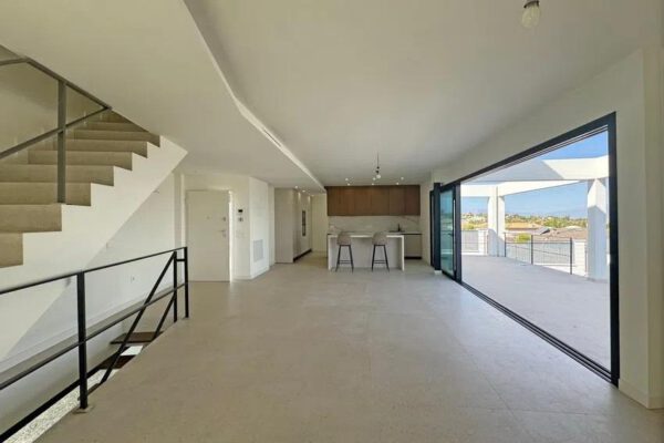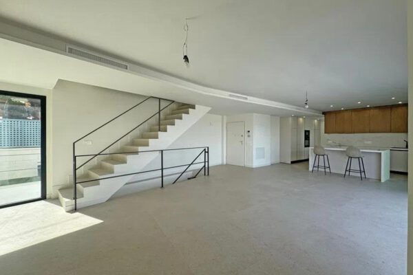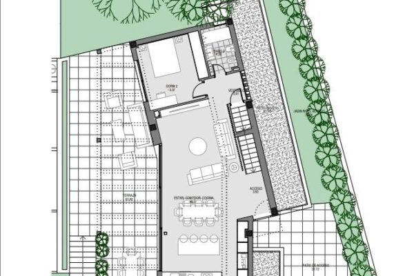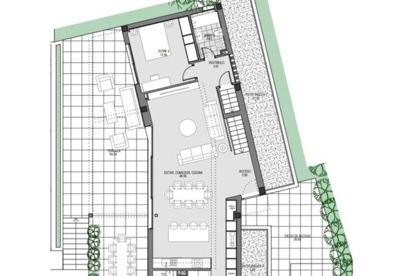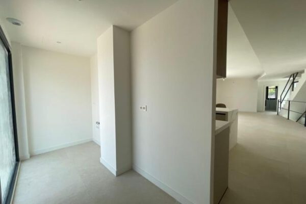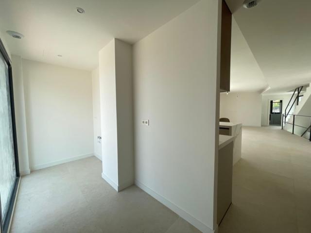un elegante vestíbulo da paso a un luminoso salón-comedor integrado con cocina abierta. además se encuentra un dormitorio principal junto a baño completo en planta alta que conecta directamente hacia una espectacular terraza.
